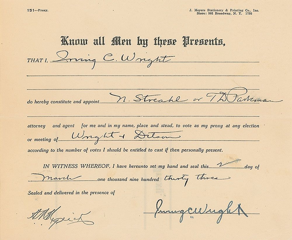 Tennis player (1882–1953) who partnered with Molla Bjurstedt to win the 1917 US National Championship in mixed doubles by defeating Bill Tilden and Florence Ballin. Rare partly-printed DS, signed “Irving C. Wright,” one page, 8.25 x 7, March 2, 1933. Wright appoints “N. Streahl or T. D. Parkman attorney and agent for me and in my name, place and stead, to vote as my proxy at any election or meeting of Wright & Ditson.” Signed at the conclusion by Wright. In fine condition, with expected document wear.
