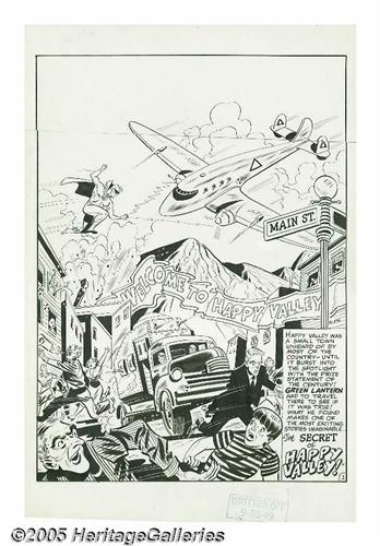 <B>Irwin Hasen (attributed) - Unpublished Green Lantern Splash Page 1 Original Art (DC, circa 1949).</B></I> As the Golden Age came to a close, Green Lantern's title was canceled with issue #38 in 1949. The splash page to "The Secret of Happy Valley" has a production note, "written off 9-30-49." As with other written-off stories from this era, this page was rescued from certain doom by DC staffers who, when ordered to cut the original art pages in half, did so rather carefully. This page was cut at the top of page, three and a half inches from the top panel border, mostly through the plane's wing and tail. A story number, GL37C, may indicate that the yarn was slated to appear in the third story slot of <B>Green Lantern</B></I> #37. Perhaps it was bumped by the new feature, Streak. The image area of the art is 13" x 18". Other than the page being cut into two pieces, the art is in Very Good condition.