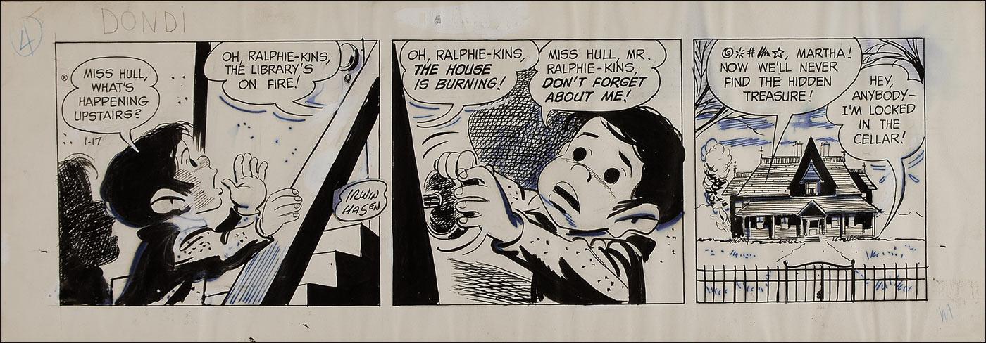 Original hand-inked three-panel Dondi daily comic strip, dated 1974 on an off-white 18.5 x 6.5 piece of artist’s cardstock. Strip depicts Dondi being trapped in a cellar during a house fire. Signed in black ink in the first panel, “Irwin Hasen.” A ‘reverse image’ of the character, in pencil, is visible on the reverse. Mild rippling, a few stray ink marks, and some ink bleeding, otherwise fine condition.