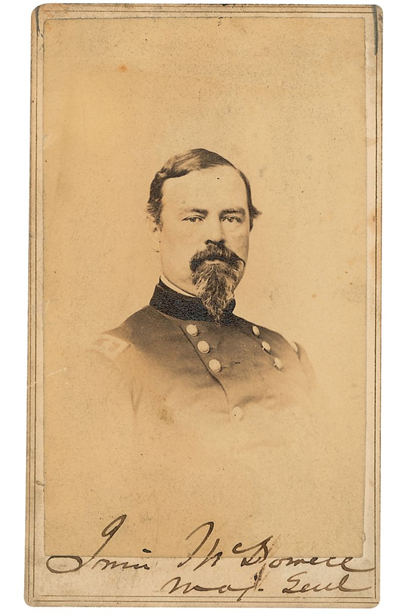 Career army officer (1818-1885) famous for his defeat during the First Battle of Bull Run. Original 2.25 x 4 carte-de-visite photo of McDowell in uniform, by Charles D. Fredricks & Co. of New York, signed along the bottom in black ink, “Irwin McDowell, Maj. Genl.” Scattered light soiling to image and bottom border, a bit heavier to reverse, and some light silvering to darker areas of image, otherwise fine condition.