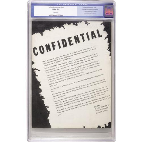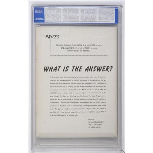 Here's scarcity for you: "only two known copies," says Overstreet. And this is the only copy that CGC has certified. This is not strictly speaking a variant, as it has somewhat different content than the regular edition of the widely distributed anti-communist comic (and we do mean "widely distributed" -- some four million copies of the color edition were printed). Overstreet says "Contains script and art edited out of the color edition, including one page of extreme violence showing a mob nailing a Cardinal to a door... the two black and white copies listed... surfaced in 1979 from the Catechetical Guild's old files in St. Paul, Minnesota." The message printed on the cover even states that the comic "contains a number of errors that we are now correcting." The cover message goes on to solicit suggestions regarding distribution as well as how to improve the content. And the back cover message is also tantalizing: it asks for ideas on what might be included in a planned future promotional comic with the working title <B>This Is The Answer</B></I>, which would have elaborated on the alternative to communism. For anyone who collects this genre of comic, or anti-communist memorabilia in general, this all but unique item represents the pinnacle! Overstreet 2006 NM- 9.2 value = $1,200. CGC census 12/06 (for this edition): 1 in 9.6, none higher.<BR><BR><b>Shipping:</b> Slabbed Comic (<a target="_blank" href="http://www.heritageauctions.com/common/shipping.php">view shipping information</a>)