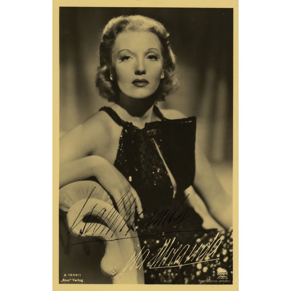 Italian actress (1905–1982) who was one of the most significant actresses of Europe from the 1930s through 1950s. She enjoyed international popularity in the 1930s—especially in France, Germany, and Austria—and became the only international movie star produced by fascist cinema. Vintage matte-finish 3.5 x 5.5 postcard photo of Isa Miranda, neatly signed in fountain pen. Also bears a printed signature in white. In fine condition.