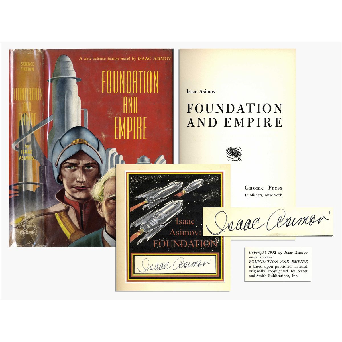 Author-signed first edition of ''Foundation and Empire'' by Isaac Asimov. Gnome Press: New York: 1952. An excellent copy of the second book in the Foundation Trilogy, perhaps the best-known science fiction series of all-time. Asimov signs clearly on a bookplate on the front free endpaper. In the first state, unclipped Edd Cartier dustjacket and original red cloth boards. 5.5'' x 8.25'', 247pp. book shows light wear to edges and toning throughout. Dustjacket, pastedown and endpapers have light foxing. Overall near fine.