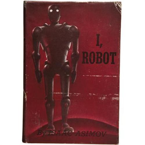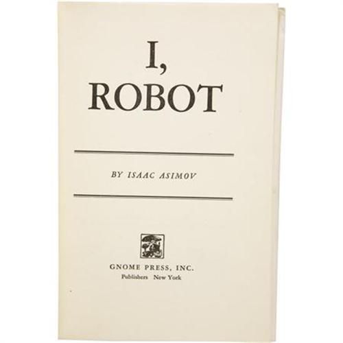 <B>Isaac Asimov. </B></I><B><I>I, Robot</B></I></B></I>. New York: Gnome Press, Inc., 1950. <BR>First edition (so stated on the copyright page). Octavo. 253 pages. Jacket design by Edd Cartier.<BR><BR>Publisher's red cloth decoratively stamped and lettered in black. Asimov's second book and the first appearance of the "Three Laws of Robotics". Boards have mild shelf wear and bumped corners. Textblock shows minimal toning on the edges. The jacket shows mild rubbing to the panels, minor abrading to the front panel and spine, and wear at the folds. The ends of the spine display minor wear as well. Overall, a very good copy of Asimov's great novel. <I>From the Robert and Diane Yaspan Collection.</B></I><BR><BR><b>Shipping:</b> Books & Catalogs (<a target="_blank" href="http://www.heritageauctions.com/common/shipping.php">view shipping information</a>)