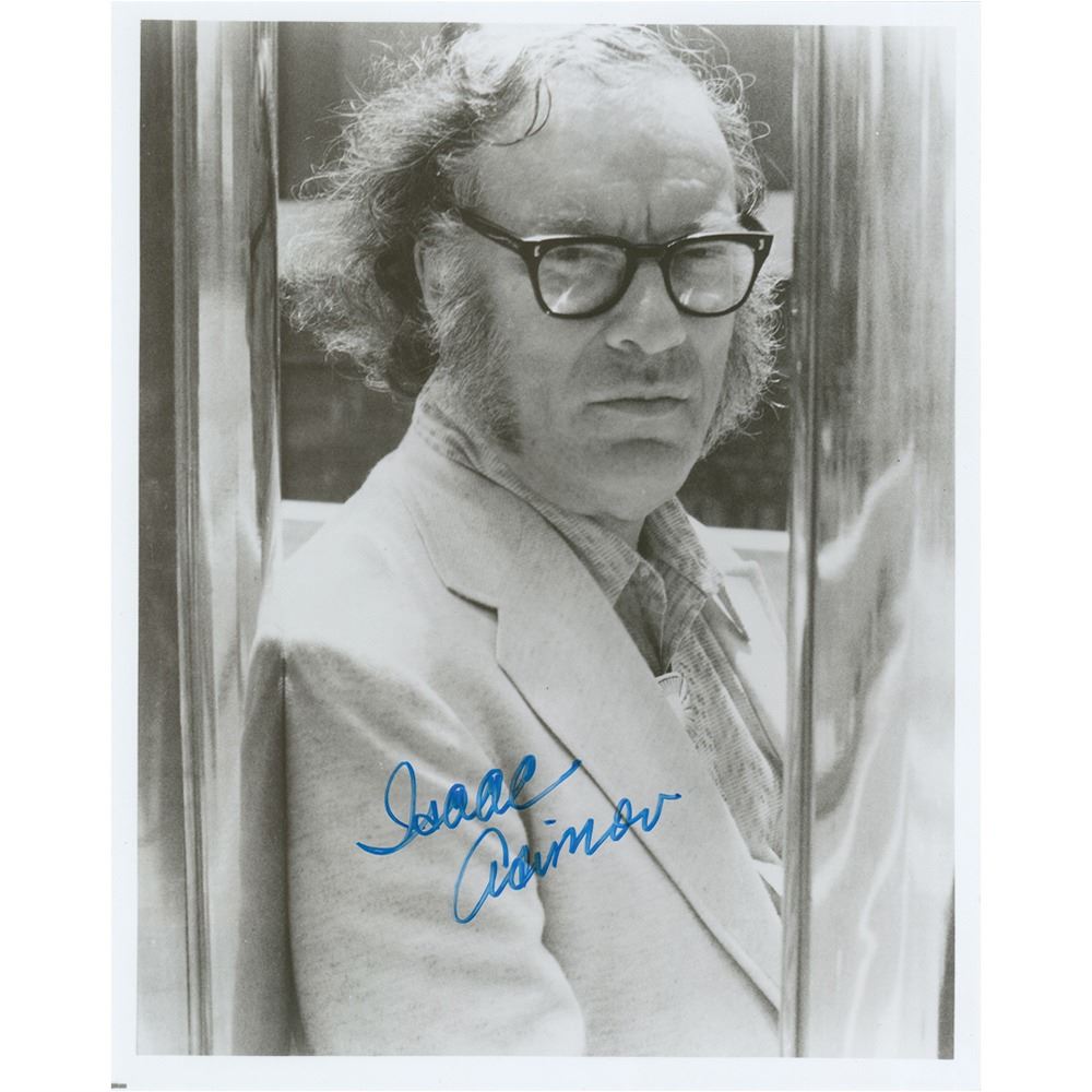 Glossy 8 x 10 photo of the great science fiction author, signed in blue felt tip, "Isaac Asimov." In fine condition.