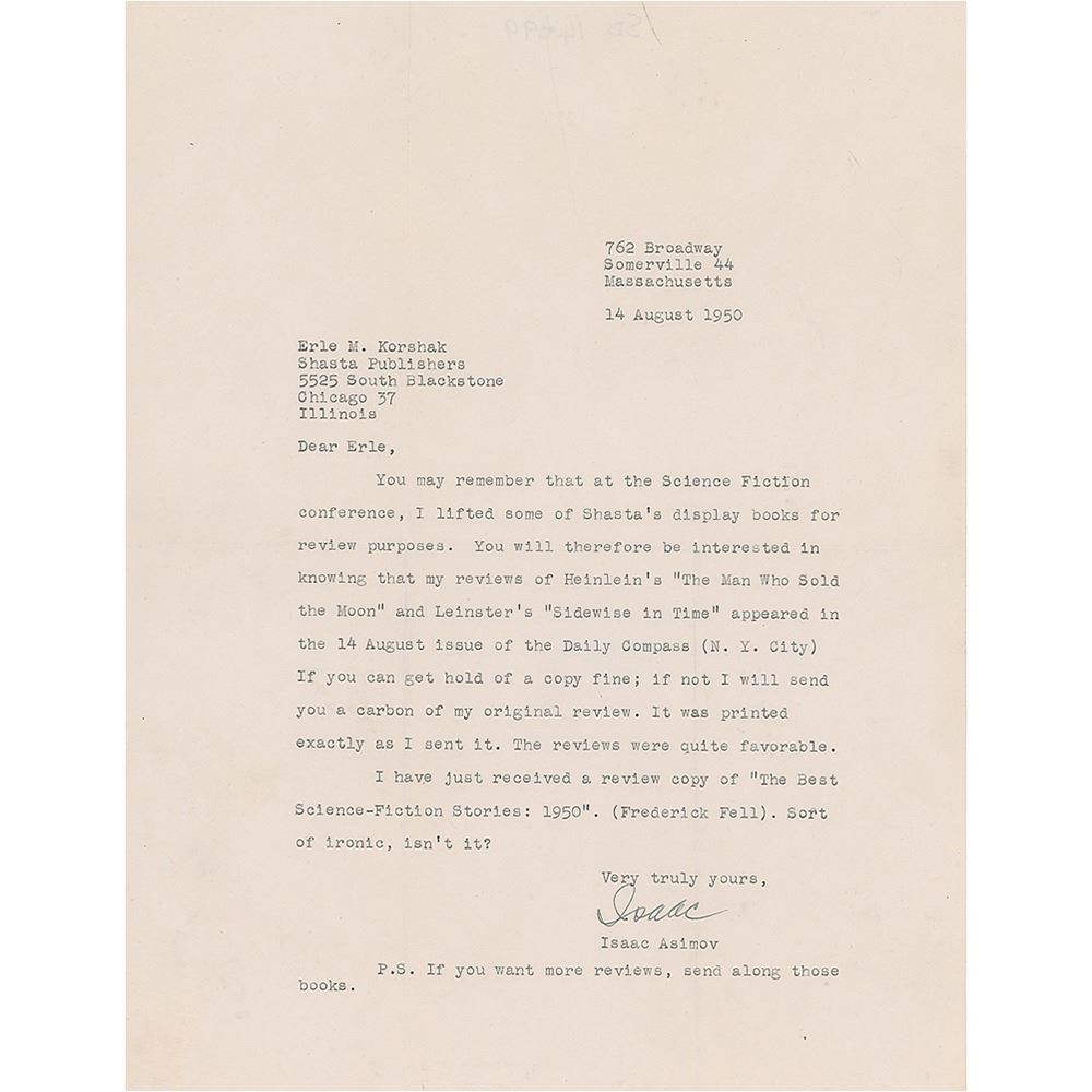 TLS signed “Isaac,” one page, 8.5 x 11, August 14, 1950. Letter to Erle M. Korshak of Shasta Publishers, in part: "You may remember that at the Science Fiction conference, I lifted some of Shasta's display books for review purposes. You will therefore be interested in knowing that my reviews of Heinlein's 'The Man Who Sold the Moon' and Lesiner's 'Sideways in Time' appeared in the 14 August issue of the Daily Compass (N. Y. City)…The reviews were quite favorable." In fine condition.