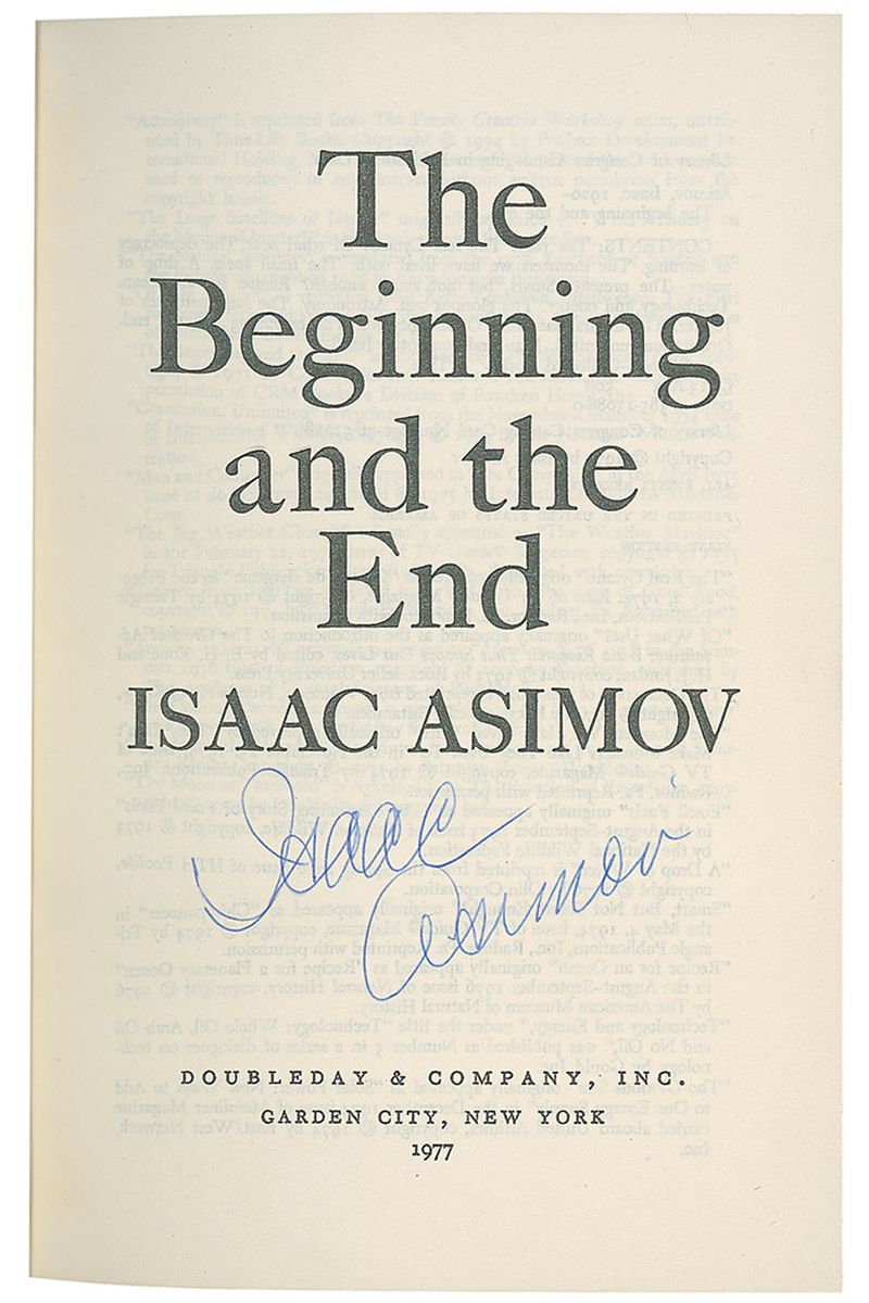 Signed book: The Beginning and the End. First edition. NY: Doubleday, 1977. Hardcover with dust jacket, 5.75 x 8.5, 248 pages. Signed on the title page in blue ballpoint. In fine condition, with scattered creases and light tears to dustjacket.