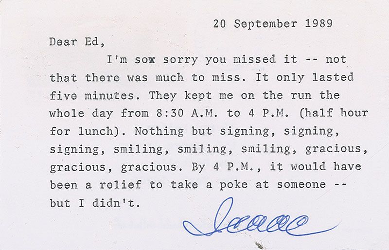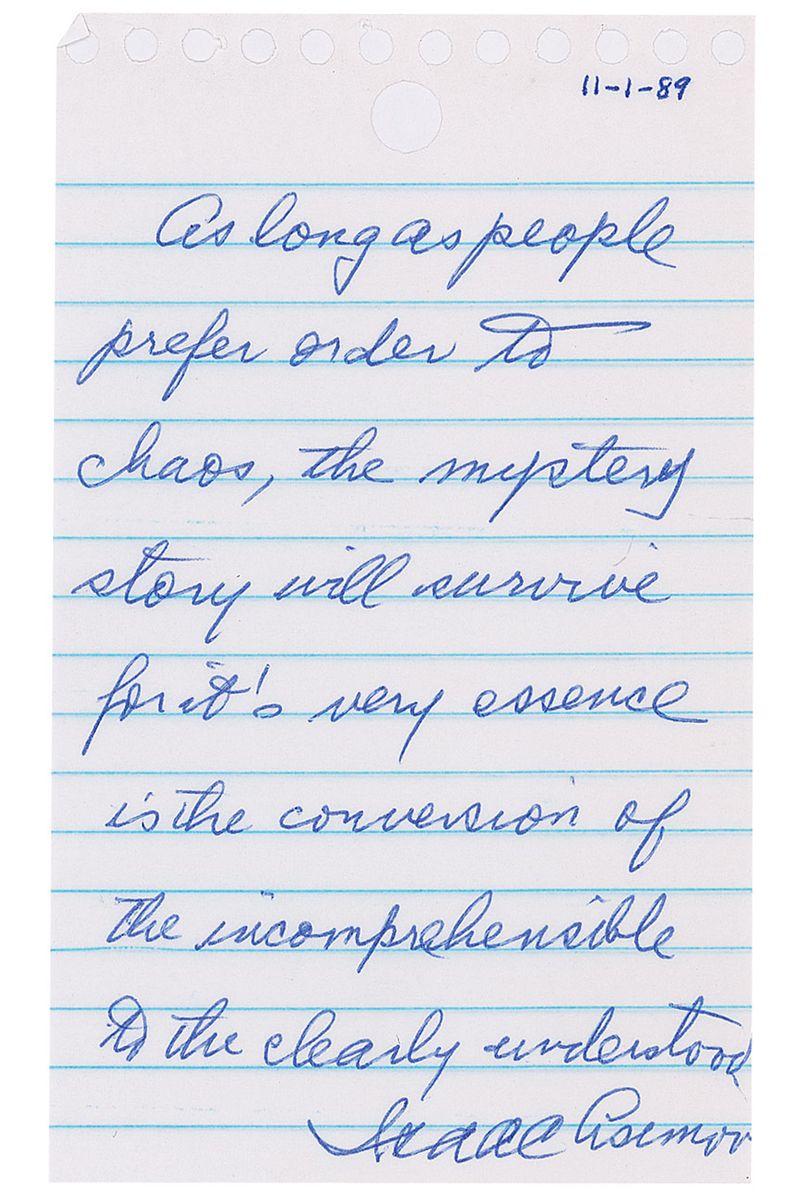 AQS on one lined page, 3 x 5, November 1, 1989, offering a thought on the mystery genre. In full: “As long as people prefer order to chaos, the mystery story will survive for its very essence is the conversion of the incomprehensible to the clearly understood”; and a TLS signed “Isaac,” one page on a 5.5 x 3.5 postcard, September 20, 1989, describing a book signing. In part: “Nothing but signing, signing, signing, smiling, smiling, smiling, gracious, gracious, gracious. By 4 P.M., it would have been a relief to take a poke at someone—but I didn’t.” In overall fine condition.