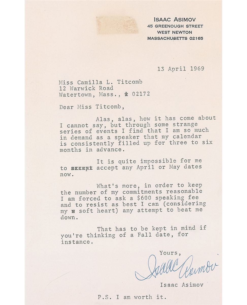 TLS, one page, 5.5 x 8.5, personal letterhead, April 13, 1969. Letter to Camilla L. Titcomb in response to a request for his participation at an event, in part: “Alas, alas, how it has come about I cannot say, but through some strange series of events I find that I am so much in demand as a speaker that my calendar is consistently filled up for three to six months in advance…What’s more, in order to keep the number of my commitments reasonable I am forced to ask a $600 speaking fee and to resist as best I can (considering my soft heart) any attempt to beat me down.” Below his signature, Asimov has added a humorous typed postscript, “P.S. I am worth it.” In fine condition, with small block of toning near top from tape on reverse. Accompanied by the original mailing envelope.