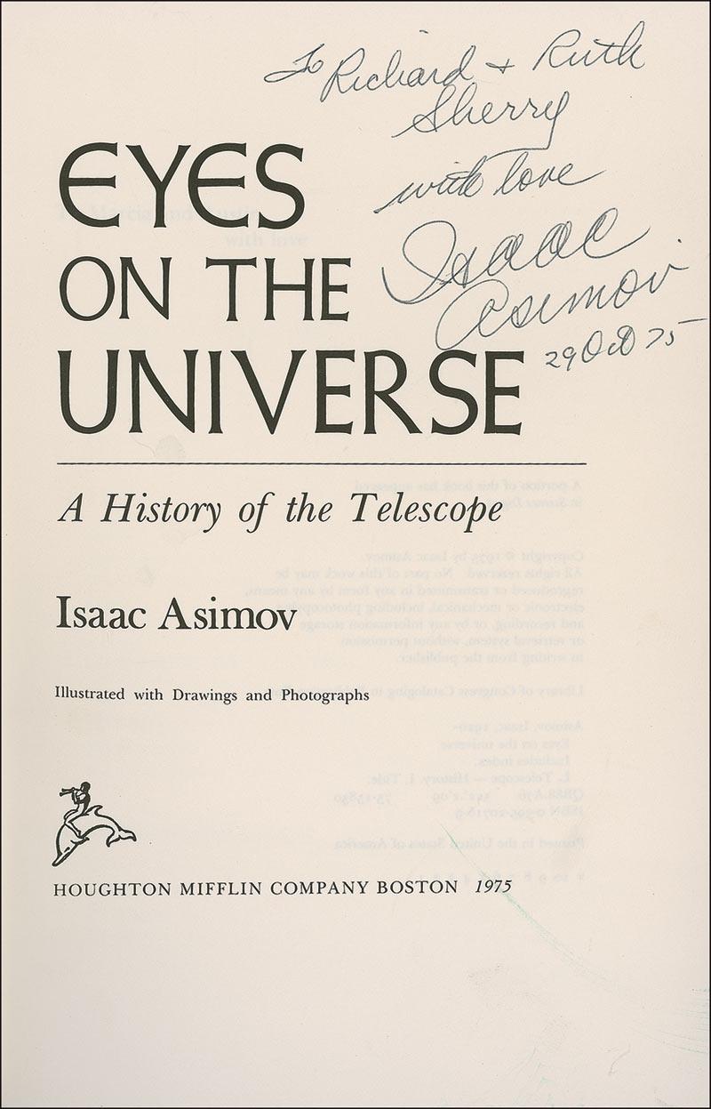 Signed book: Eyes on the Universe. First edition, first printing. NY: Houghton Mifflin Company, 1975. Hardcover with dustjacket, 6.5 x 9.5, 274 pages. Signed and inscribed in black ballpoint on the title page, “To Richard & Ruth Sherry with love Isaac Asimov 29 Oct 75.” In fine condition, with very light soiling to the pages, a penciled notation on the half-title page, and a price-clipped dustjacket. RRAuction COA.