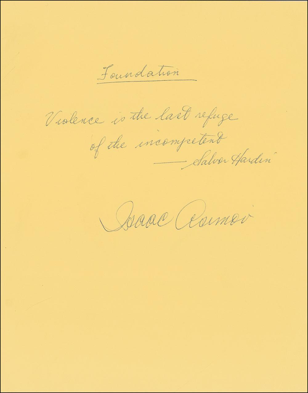 AQS, signed “Isaac Asimov,” on an 8 x 10 yellow sheet. Asimov pens a quote from his science fiction novel, ‘Foundation.’ In full: “Violence is the last refuge of the incompetent—Salvor Hardin.” In fine condition with a couple of light creases and handling wear