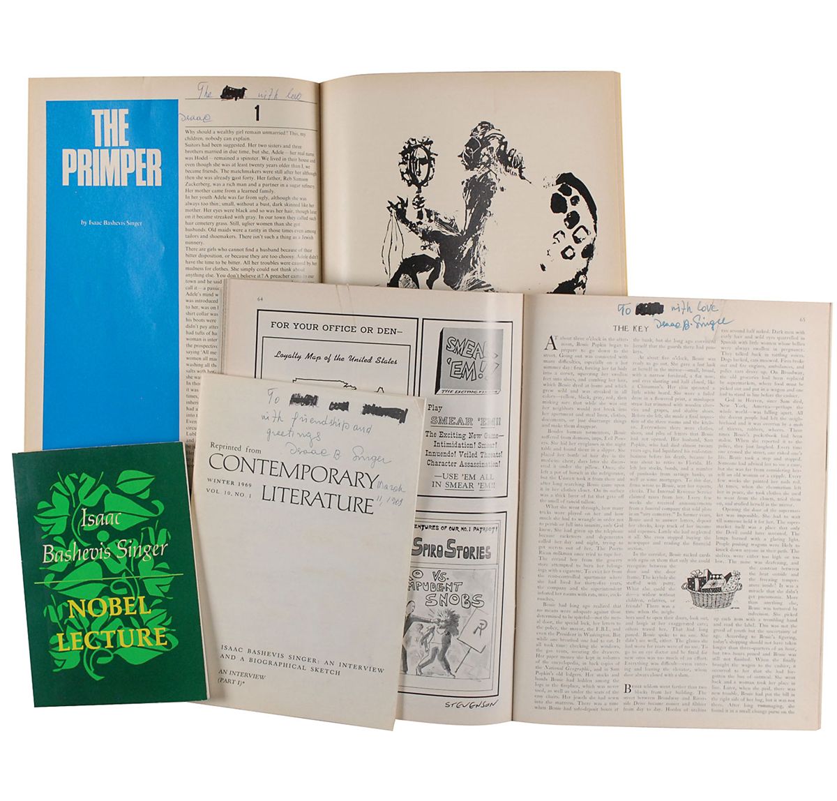 Author of Yiddish short stories, plays, and novels (1902–1991) and the 1978 Nobel Laureate for literature. Collection of four booklets and magazines, each signed and inscribed by Singer in ink on the front cover, first free end page, or page with his article. Publications include: Nobel Prize Lecture, Contemporary Literature, The New Yorker, and Israel Magazine. In overall very good condition, with the recipient’s name blacked out in all inscriptions.