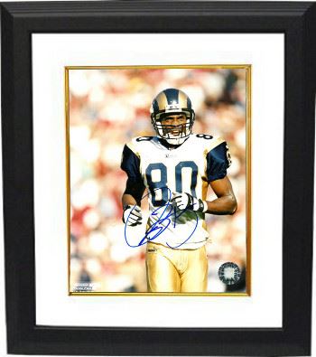 Isaac Bruce was drafted by the Los Angeles Rams in the second round of the 1994 NFL Draft. An All-Pro and four-time Pro Bowl selection, Bruce has amassed 15,208 receiving yards in his career (third all-time). He played the first 14 years with the Rams and won a Super Bowl ring with the team in Super Bowl XXXIV. Isaac Bruce has hand autographed this St. Louis Rams 8x10 Photo. Certificate of Authenticity from Athlon Sports. Custom White Mat and Black Framed as shown.