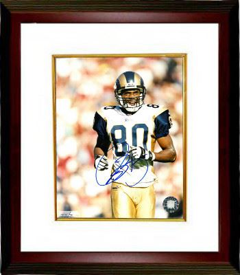 Isaac Bruce was drafted by the Los Angeles Rams in the second round of the 1994 NFL Draft. An All-Pro and four-time Pro Bowl selection, Bruce has amassed 15,208 receiving yards in his career (third all-time). He played the first 14 years with the Rams and won a Super Bowl ring with the team in Super Bowl XXXIV. Isaac Bruce has hand autographed this St. Louis Rams 8x10 Photo. Certificate of Authenticity from Athlon Sports. Custom White Mat and Mahogany Framed as shown.