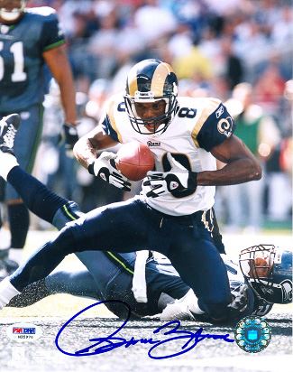 Isaac Bruce was drafted by the Los Angeles Rams in the second round of the 1994 NFL Draft. An All-Pro and four-time Pro Bowl selection, Bruce has amassed 15,208 receiving yards in his career (third all-time). He played the first 14 years with the Rams and won a Super Bowl ring with the team in Super Bowl XXXIV. Isaac Bruce has hand autographed this St. Louis Rams 8x10 Photo. PSA Hologram and Certificate of Authenticity.