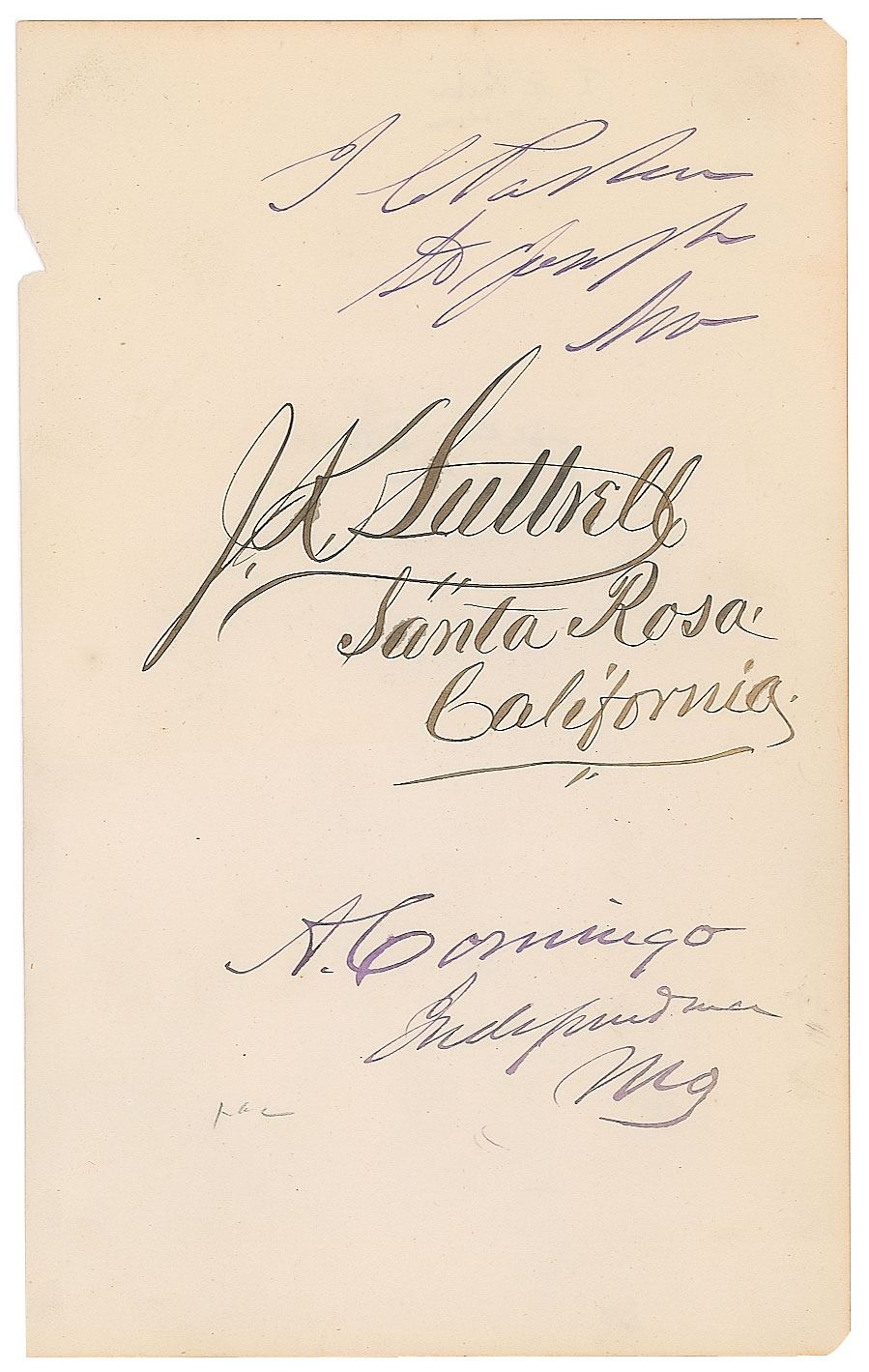 Fearless and determined justice (1838-1896) of the Indian Territory in western Arkansas who earned the nickname 'The Hanging Judge' because of the great number of convictions he secured against criminals, renegades, and fugitives from justice. Vintage fountain pen signature, "I. C. Parker, St. Joseph, Mo.,” on an off-white 5.25 x 8.75 sheet, which is also signed by California Congressman John K. Luttrell and Missouri Congressman Abram Comingo. These three men simultaneously served terms as state representatives between 1873 and 1875. In fine condition.