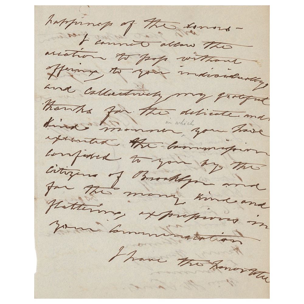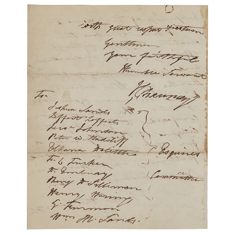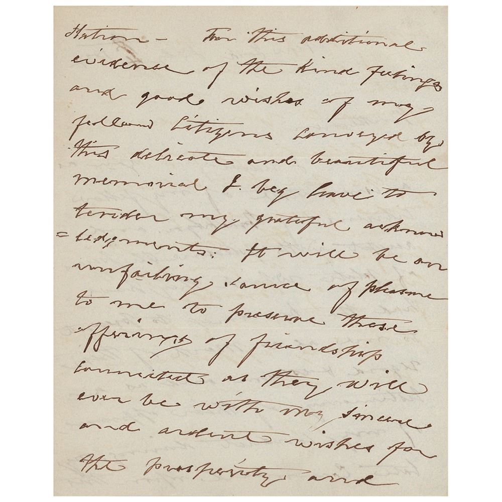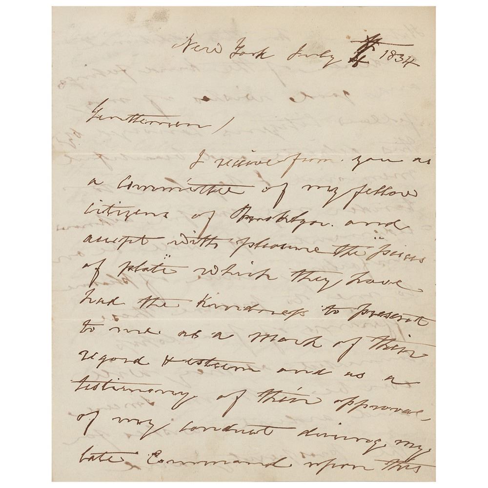 Commodore (1772–1840) in the United States Navy who served in the Quasi-War, The Barbary Wars and the War of 1812. ALS, four pages on two adjoining sheets, 7.75 x 9.75, July 4, 1834. Handwritten letter to a Brooklyn committee, thanking them for a gift. In part: "I receive from you as a committee of my fellow citizens of Brooklyn and accept with pleasure the pieces of plate which they have had the kindness to present to me as a mark of their regard & esteem and as a testimony of their approval of my conduct during my late command." In very good to fine condition, with a rusty circular paperclip impression to the top and some adhesive remnants along the edge.