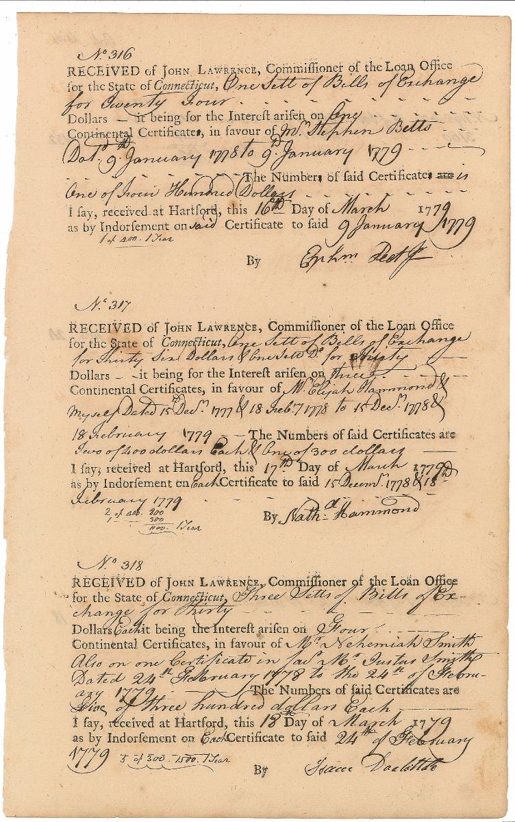 American clockmaker, printer, and supplier of gunpowder to the Continental Army (1722–1800). Revolutionary War–dated partly-printed DS, signed “Isaac Doolittle,” one page, 8 x 12.75, February 24, 1779. Bill of exchange, in part: “Received of John Lawrence, Commissioner of the Loan Office of the State of Connecticut, Three Setts of Bills of Exchange for Thirty Dollars Each it being the Interest arisen on Four Continental Certificates.” In fine condition. Doolittle is credited with producing the first American-made printing press for Philadelphia printer William Goddard in 1769 and for making what many scholars view as the first brass-wheel clock produced in America.