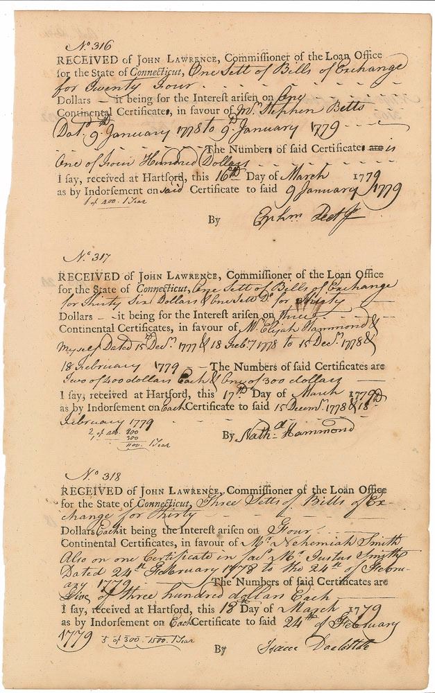 American clockmaker, printer, and supplier of gunpowder to the Continental Army (1722-1800). Revolutionary War-dated partly-printed DS, signed "Isaac Doolittle," one page, 8 x 12.75, February 24, 1779. Bill of exchange, in part: "Received of John Lawrence, Commissioner of the Loan Office of the State of Connecticut, Three Setts of Bills of Exchange for Thirty Dollars Each it being the Interest arisen on Four Continental Certificates." In fine condition. Doolittle is credited with producing the first American-made printing press for Philadelphia printer William Goddard in 1769 and for making what many scholars view as the first brass-wheel clock produced in America.