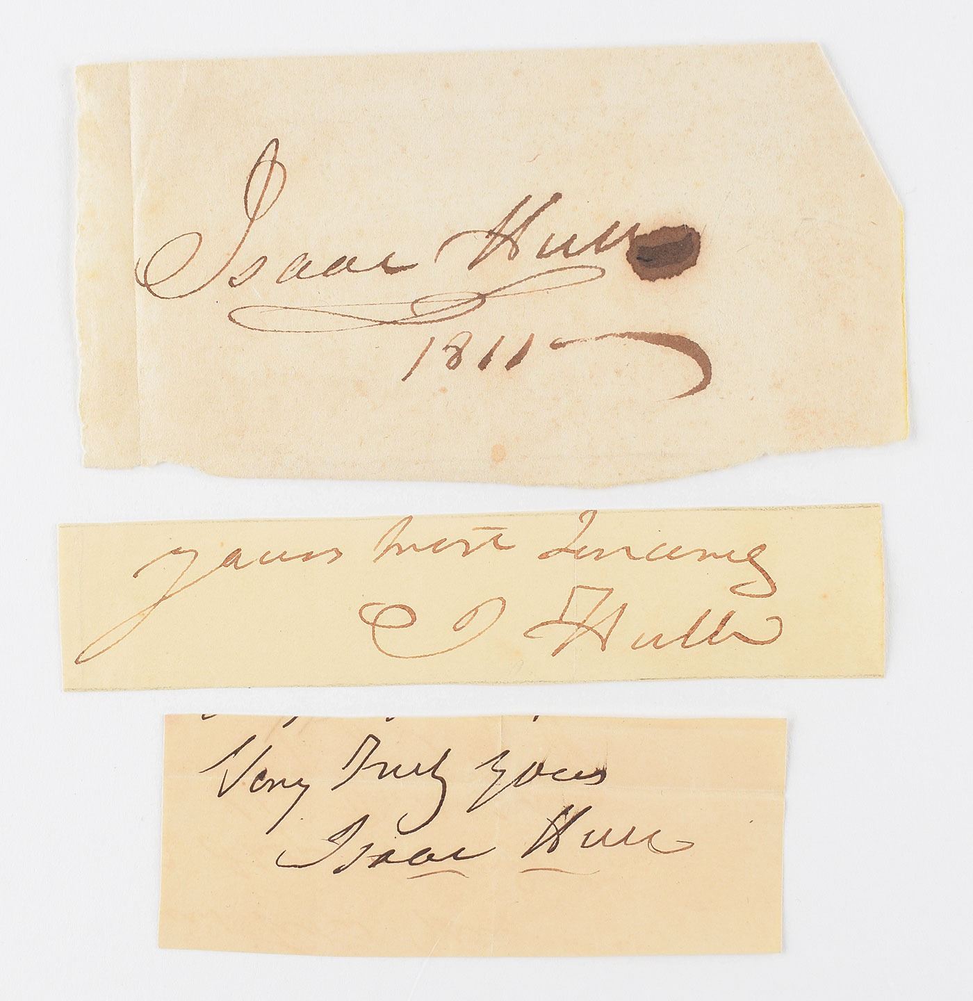 American commodore (1773–1843) who commanded 'Old Ironsides,' the USS Constitution, during the War of 1812. Three ink signatures, "Isaac Hull, 1811," "Yours Most sincerely, I. Hull," and "Very Truly Yours, Isaac Hull," on individual off-white slips ranging in size from 3.75 x 1.25 to 5 x 2.75. In overall fine condition.