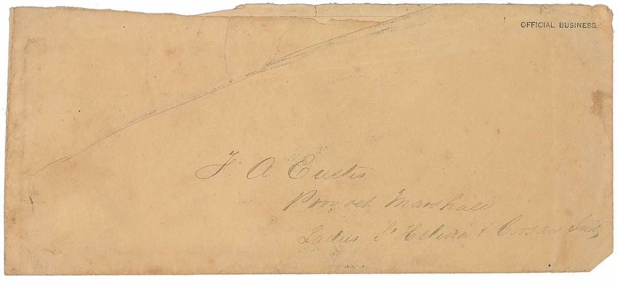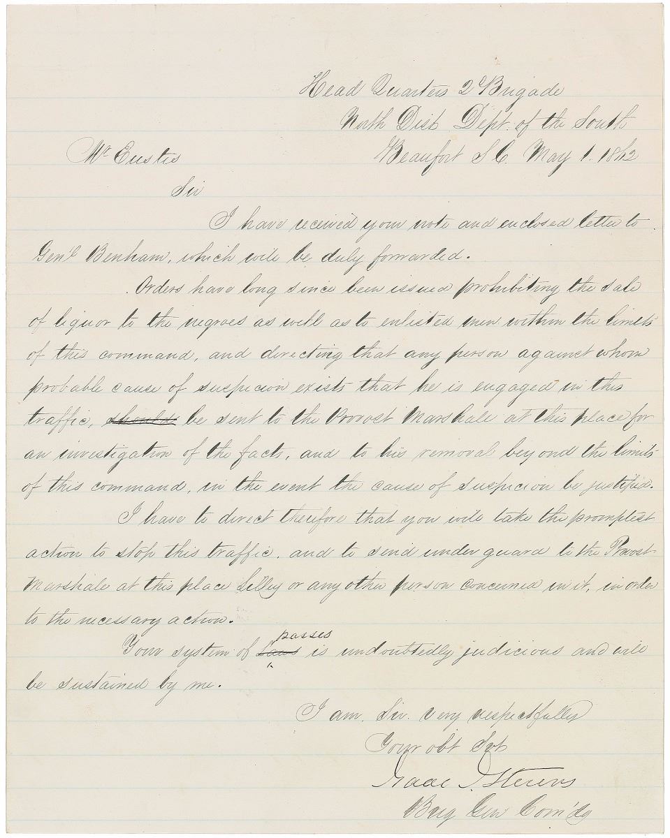 First governor of the Washington Territory (1818–1862), United States congressman, and a brigadier general in the Union Army during the Civil War until his death at the Battle of Chantilly. Civil War–dated LS, one page, 7.75 x 9.75, May 1, 1862. Letter to Provost Marshal Eustis. In part: “Orders have long since been issued prohibiting the sale of liquor to the negroes as well as to enlisted men within the limits of this command, and directing that any person against whom probable cause of suspicion exists that he is engaged in the traffic, be sent to the Provost Marshal at this place for investigation.” In fine condition. Accompanied by the original transmittal envelope. Stevens was killed in battle just four months later when he was charging forward with his troops while carrying the banner of Saint Andrew's Cross.