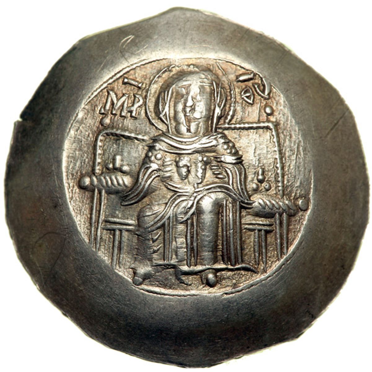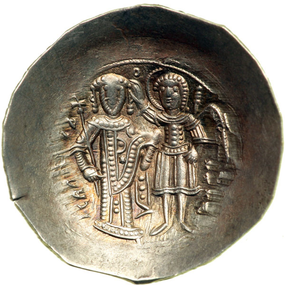 Isaac II, Angelus, 1185-1195. Electrum Aspron Trachy (3.63 g) minted at Constantinople. The Virgin enthroned, facing. Reverse: Isaac II and Archangel Michael standing. Ratto 2178; Hendy plate 20, 5-8; S. 2002. Light graffiti on obverse, short snip at edge. Very Fine.