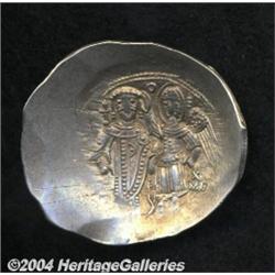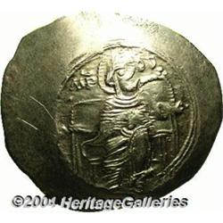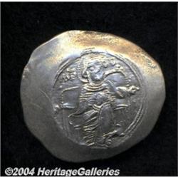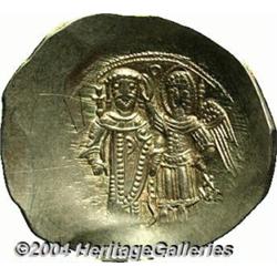 <B>Isaac II.</B></I> 1185-1195. EL aspron trachy (29 mm, 3.75 g). Constantinople. The Virgin enthroned facing, holding the nimbate head of the infant Christ / Isaac standing facing, holding cruciform sceptre and akakia, being crowned by Archangel Michael standing facing. DOC 2; Hendy pl. 20, 5-8; SB 2002. Near XF. <BR><I>From the Geneva Collection.</B></I> <BR><BR><B>Important notice:</B> Heritage usually auctions material at the rate of 200-250 lots per hour. On some occasions eBay Live bid software or the Internet may not be able to keep up with the pace of the auction. We recommend placing a realistic absentee bid now as insurance to avoid disappointment. Occasionally the auctioneer may eliminate or reject an eBay Live bid, and the auctioneer may also reopen a lot after the close of the eBay live bidding (usually because we missed an audience bid), and may reject your bid even if it shows you as the winning bidder. By bidding via eBay Live, you agree that Heritage may award the lot to another bidder at its sole discretion under the circumstances described above or any other reasonable circumstances. Since eBay bids are not shown to us until we open the lot on the floor, we treat those bids just like floor bids. In most cases the floor responds before the eBay bid is presented to us, due to Internet lag time, so for consistency we have made it a policy that floor bids are always considered first over tie eBay live bids. Also please note that all Heritage lots purchased through eBay Live carry a 20% Buyer's Premium. Please make sure you read the Terms and Conditions before you bid.