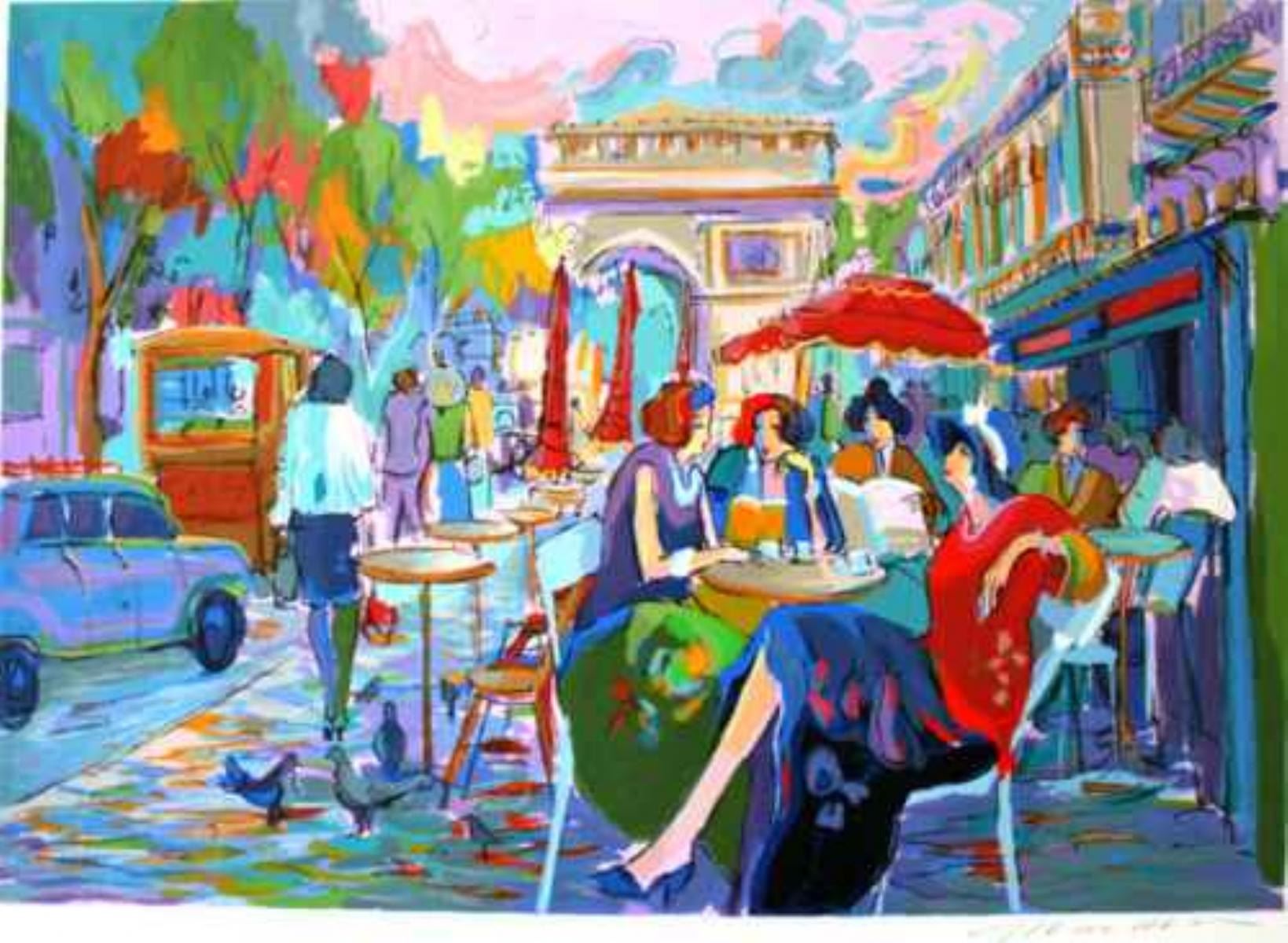 Isaac Maimon "Bus Stop Cafe" Hand Signed and Numbered Limited Edition Serigraph, Publisher's Certificate of Authenticity Dimensions: 25 x 36 inches (Note: edition number received may differ from photo)
