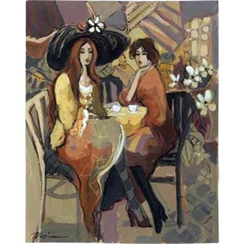 Women meeting in somewhat hazy coffee houses, colors that are bold and bright, the essence of a true urban scene, daytime life and nightlife intermingle. It is a warm, gentle and inviting atmosphere. The air is full of promises and secrets just like any self-respecting bistro. This is Isaac Maimon?s world, the scene that he paints with consuming passion. Maimon?s paintings capture the 'boulevard culture', that uniquely French atmosphere that so intrigued Lautrec, Bonnard and other artists before him. Though strongly influenced by the Paris school of art, with his intrepid use of color and line he creates works that are absorbing, rich and uniquely Maimon.