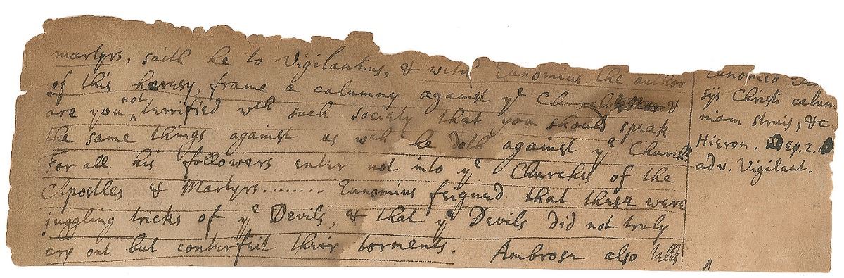 Handwritten manuscript fragment, unsigned, one page, 7.5 x 2.25, no date but circa 1700. An eight-line fragment plus four marginal citations from an apparently unpublished theological work by Newton. In part: “Martyrs, saith he to Vigilantius, &…Eunomius the author of this heresy, frame a calumny against ye Church & are you not terrified wth such society that you should speak the same things against us wch he doth against ye Church? For all his followers enter not into ye Churches of the Apostles & Martyrs……Eunomius feigned that these were juggling tricks of ye Devils, & that ye Devils did not truly cry out but counterfeit their torments.” Affixed by two small pieces of archival tape to a piece of acid-free mat board, the fragile fragment is in very good condition, with a tear extending down from the top edge and staining over the left half not affecting readability whatsoever.