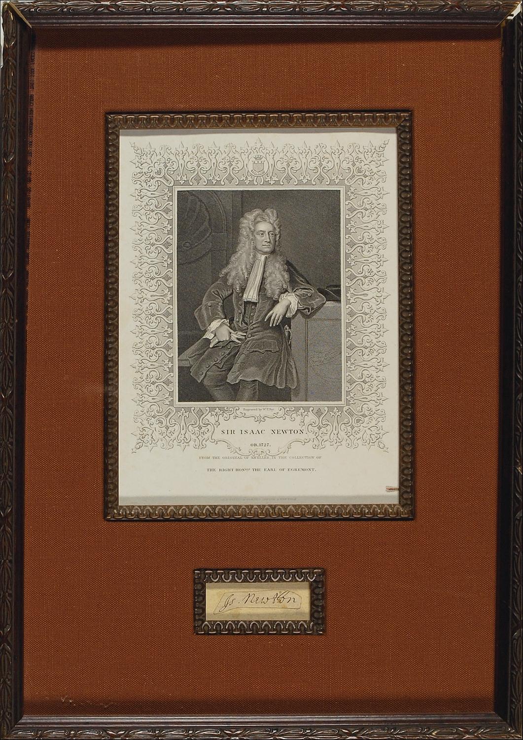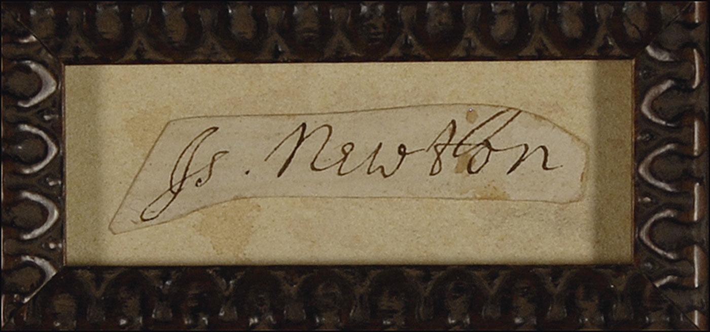 English physicist, mathematician, and astronomer (1643–1727), widely regarded as the most influential figure in the history of science, whose ideas and discoveries, including calculus, the laws of gravitation and motion, and observations on the nature of light and optics, earned him a place among the most profound geniuses in the history of mankind. Ink signature, “Is. Newton,” on an irregularly clipped off-white 2 x .5 slip. The signature is affixed to a slightly larger page. Matted with a portrait and framed to an overall size of 12 x 16.5. Scattered toning and soiling, otherwise fine condition. Newton is excessively rare in any form, with this being only the second signature we have offered.