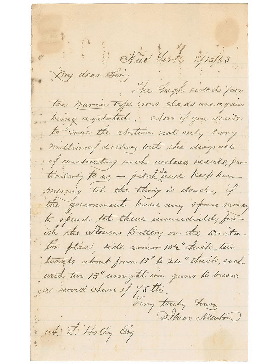 Union naval officer who served as chief engineer on the USS Monitor. War-dated ALS, one page, lightly-lined, 5 x 8, February 13, 1863. Letter to A. L. Holly. In full: “The high sided 7000 ton Warrior type irons clads are again being agitated. Now if you desire to save the Nation not only 8 or 9 millions of dollars but the disgrace of constructing such useless vessels, particularly to us—pitch in and keep hammering til the thing is dead, if the government have any spare money to spend let them immediately finish the Stevens Battery on the Dictator plan, side armor 10.5? thick, two turrets about from 18? to 24? thick, each with two 13? wrought iron guns to burn a service charge of 75tts.” In very good condition, with intersecting folds, toned areas to corners from mounting remnants to reverse, and slight mirroring to ink.
