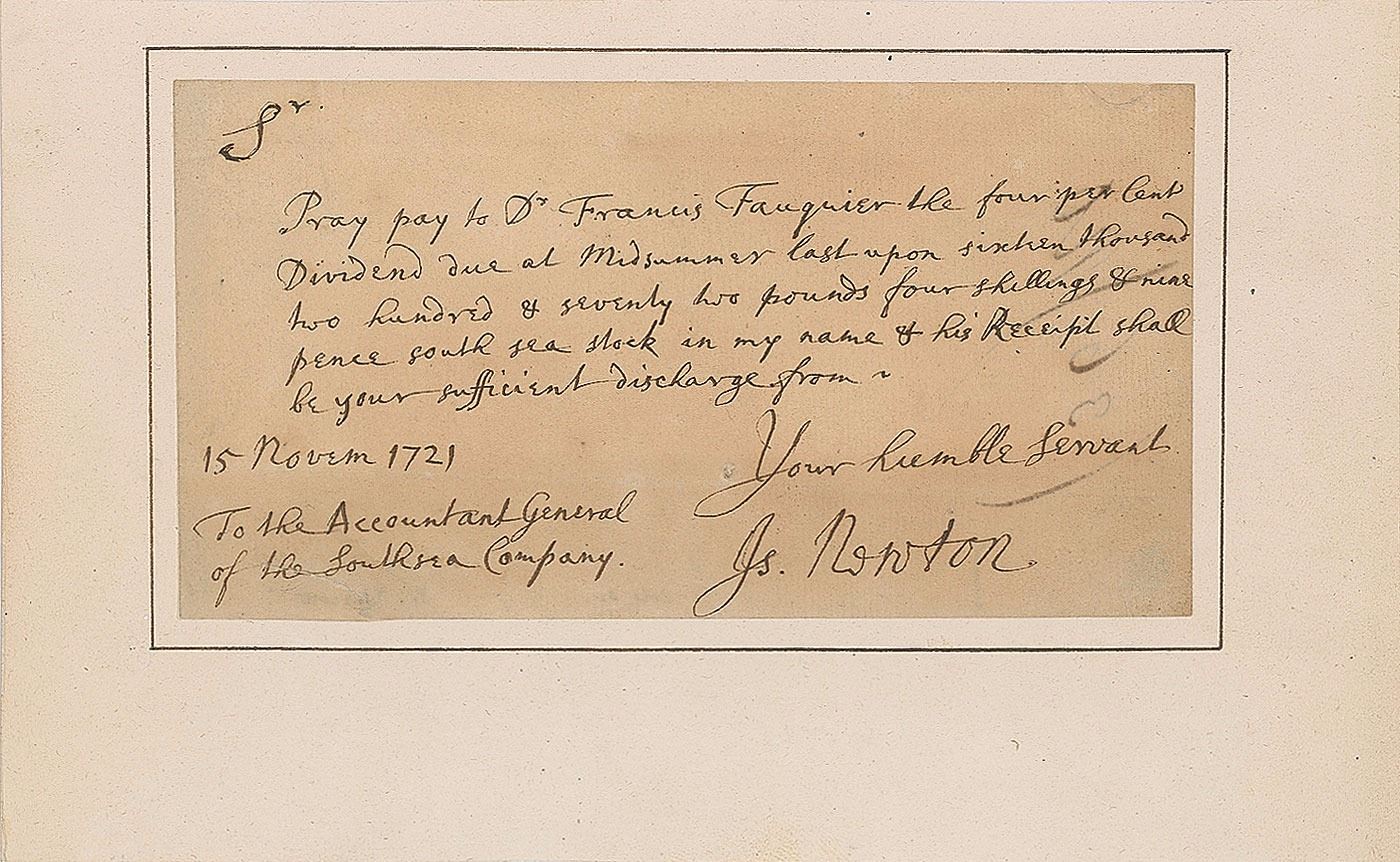 ADS, signed “Is. Newton,” one page, 5.75 x 3, November 15, 1721. Pay order issued to "the Accountant General of the South Sea Company," John Grigsby. In full: "Pray pay to Dr. Francis Fauquier the four per cent Dividend due at Midsummer last upon sixteen thousand two hundred & seventy two pounds four shillings & nine pence south sea stock in my name & his Receipt shall be your sufficient discharge." Affixed at the left edge to a larger card. In fine condition.