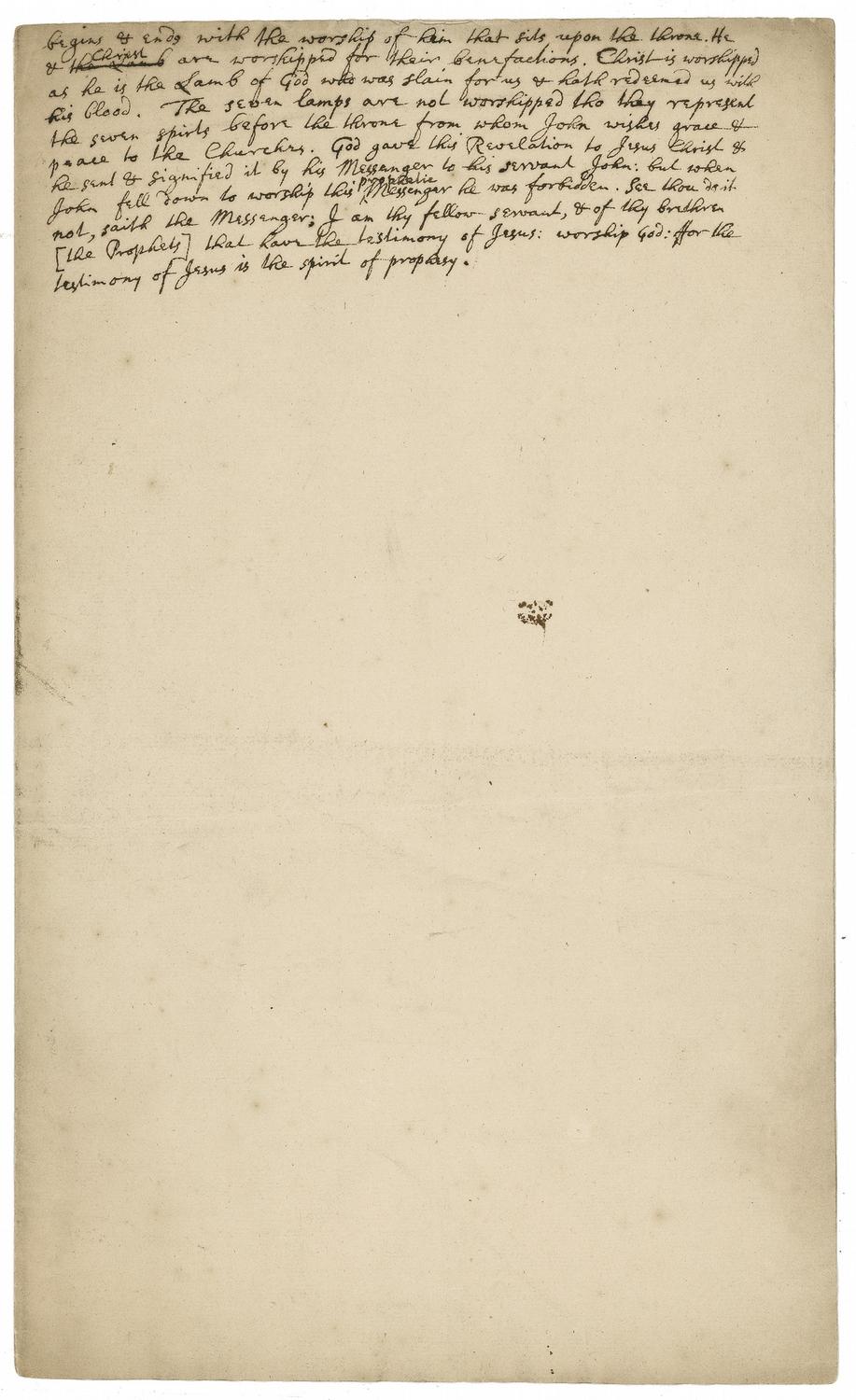 Unsigned handwritten manuscript on a 7.25 x 12 off-white sheet, Newton pens 10 lines about the Bible’s Book of Revelations: “begins & ends with the worship of him that sits upon the throne. He & Christ are worshipped for their benefactions. Christ is worshipped as he is the Lamb of God who was slain for us & hath redeemed us with his blood. The seven lambs are not worshipped tho they represent the seven spirits before the throne from whom John wishes grace & peace to the Churches. God gave this Revelation to Jesus Christ & he sent & signified it by his Messenger to his servant John; but when John fell down to worship this prophetic Messenger he was forbidden. See thou do it not, saith the Messenger; I am thy fellow servant, & of thy brethren [the Prophets] that have the testimony of Jesus: worship God: for the testimony of Jesus is the spirit of prophecy.” In very good to fine condition, with a light central vertical bend, some folds and creases to lower blank portion of page, light rippling along top edge, and some scattered light toning and soiling.