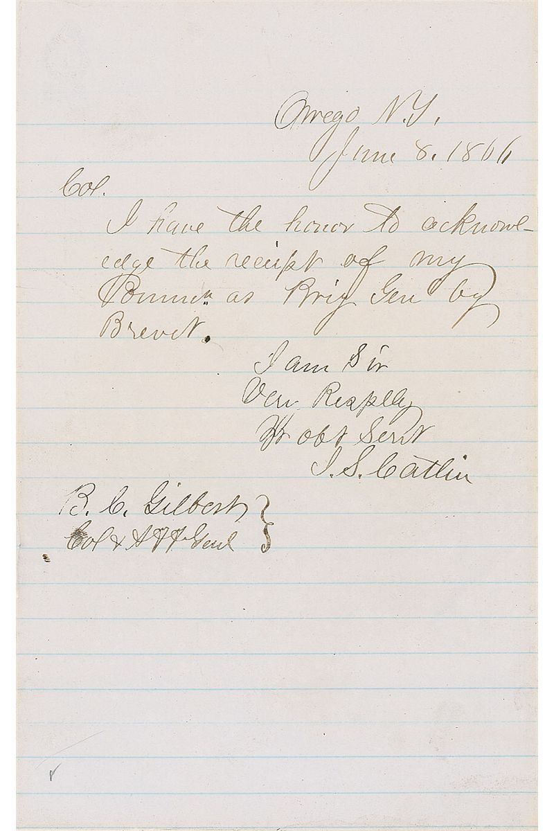 Union soldier (1835–1916) who was injured twice during the Battle of the Crater, resulting in the loss of a leg; he was awarded the Medal of Honor for his heroism. ALS signed “I. S. Catlin,” one page, lightly-lined, 5 x 7.5, Owego, New York, June 8, 1866. In full: “I have the honor to acknowledge the receipt of my Commn. as Brig. Gen. by Brevet.” Professionally inlaid into a slightly larger sheet. In fine condition, with a vertical fold and slight brush to ink.