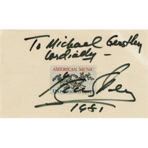 <B>Isaac Stern Autograph.</B></I> A 5" x 3" card, with a five-cent stamp affixed, signed by the violin virtuoso in black ink, and dated 1981 by Stern. His autograph extends across the face of the stamp. In Excellent condition.<BR><BR><b>Shipping:</b> Flat Material, Small (<a target="_blank" href="http://www.heritageauctions.com/common/shipping.php">view shipping information</a>)
