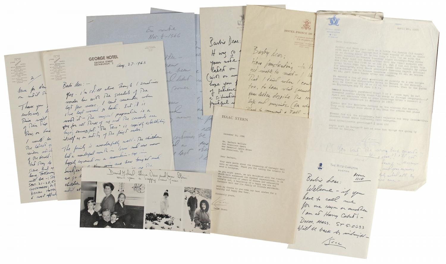Renowned and durable American concert violinist (1920–2001). Archive of approximately 90 letters, photographs and ephemera from Stern, ranging in date from the 1960s to the 1980s. This remarkable archive includes four ALSs from Stern, each signed “Isaac,” two TLSs, also signed “Isaac,” as well as many 1960s retained carbon copies of correspondence between Stern and his secretary, his wife Vera, his accountant, manager, and Sir Isaiah Berlin. Collection also includes publicity photos by Hurok Attractions (Stern's managing agency), candid photos by his secretary, concert programs, family holiday cards, a typed manuscript speech delivered to the American Jewish Cultural Foundation. One letter, dated April 4, 1967, reads, in part: “I am in europe for 6 weeks–started in London last week. Now here for 5 days (Vera arrives tomorrow) and then 3 weeks in Italy—10 concerts but am planning to do most of it by car. Should be nice. Back home on May 7th–N.Y. Phil concerts (Boston with L.B.) Then Los Ang., San Fran, Montreal & New York (Linc. Center) with the trio.” In overall very good condition. Unique collection of mostly informal narratives of personal news and business matters that reveals a caring nature and dear friendship between Stern and his secretary.