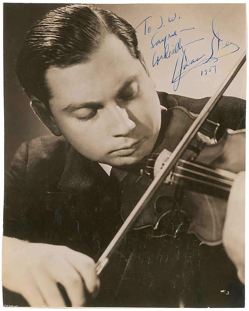 Vintage glossy 7.75 x 9.25 photo of Stern playing his violin, signed and inscribed in fountain pen “To J. W. Sayre—cordially—Isaac Stern, 1957.” Scattered creases and impressions, trimmed edges, and rubbing to finish, otherwise fine condition.