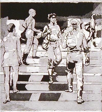 This etching is by well-known American artist and printmaker Isabel Bishop (1902 - 1988):Title: "Students on the Steps" 1981 Published 1984 Etching and aquatint 8 × 7½ Numbered from a limited edition of 75 Excellent condition; never mounted, matted or framed Certificate of Authenticity Isabel Bishop taught at the Art Students League from 1936 to 1937 and was a life member. In 1938, she worked as a Muralist for the W.P.A., and did a mural for the US Post Office in New Lexington, Ohio. She also taught at Yale and the Skowhegan Art School, Maine. She was a member of the National Academy of Design, the National Institute of Arts and Letters, the Society of American Etchers, Gravers, Lithographers, and Woodcutters. Bishop exhibited widely during her life including the Berkshire Museum, the Whitney Museum of American Art, Associated American Artists, and the Midtown Galleries, NYC. She was featured at several Venice Biennials and won awards for her work at the American Artists Group (etching), the National Academy of Design, the Corcoran Gallery of Art, Washington, DC; the American Society of Graphic Artists; the National Arts Club; the Royal Society of Arts (London), and others. Her works are in the permanent collections of at least 39 museums including the Boston Museum of Fine Arts, the Metropolitan Museum of Art, The Whitney Museum, the Brooklyn Museum, the Philadelphia Museum, the Corcoran Gallery, the Phillips Collection, the Smithsonian, and the National Academy of Design.Please click on the link below to view our other prints by Isabel Bishop.