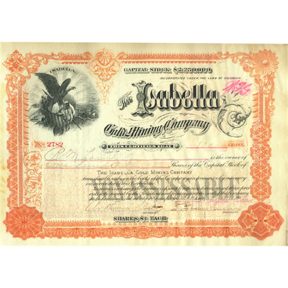 1890's, Colorado. Stock certificate . Orange/Black. Vignette of eagle at top left. Perferation cancelled. Very fine.
