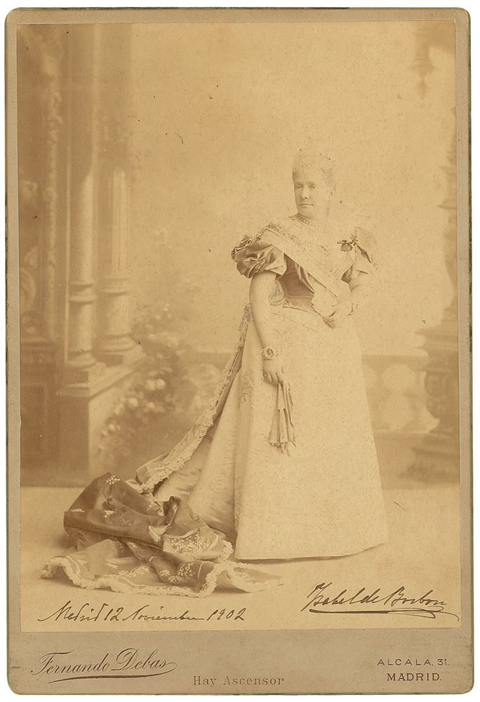 Eldest daughter (1851–1931) of Queen Isabella II of Spain, who was a prominent and popular figure during the reign of her brother, King Alfonso XII. Original 6.75 x 10 imperial cabinet photo of the princess in an elegant royal gown, by Fernando Debas of Madrid, signed at the bottom of the image in black ink, “Isabel de Borbon,” and dated November 12, 1902. In fine condition, with some mild foxing and soiling.