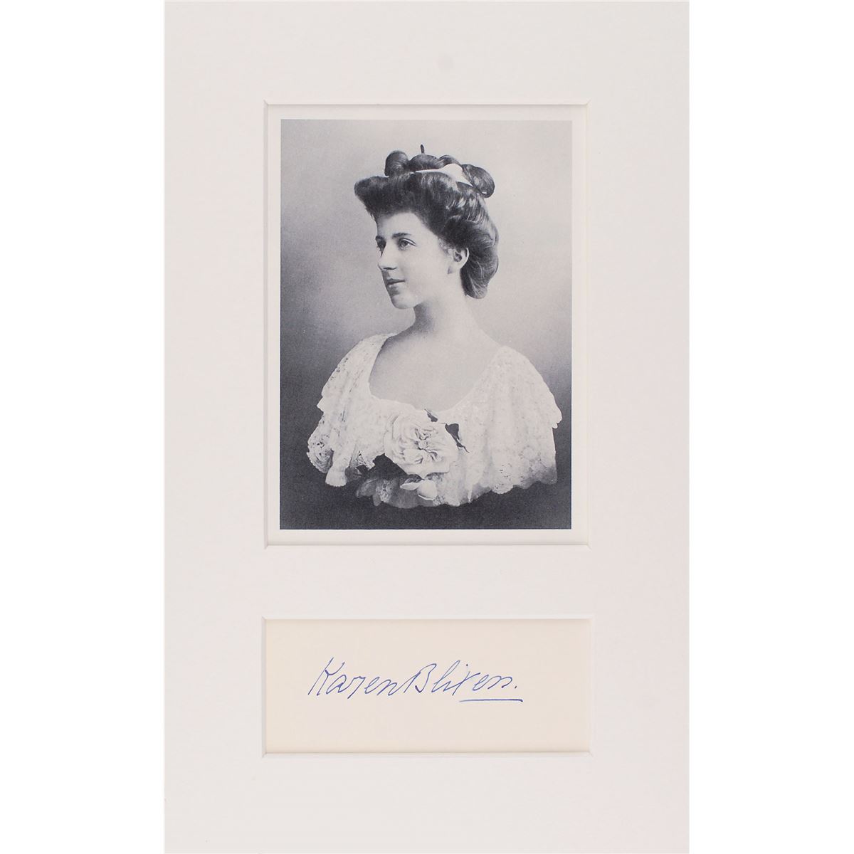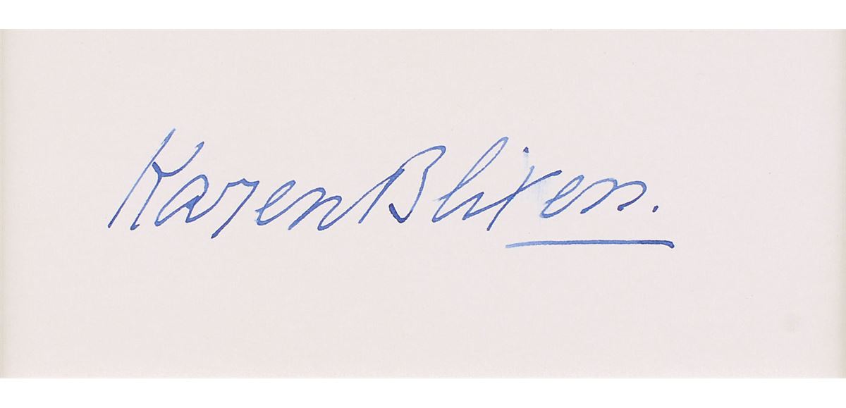 Pen name of Danish author Karen Blixen (1885–1962) best known for Out of Africa and Babette’s Feast, both of which have been adapted into Academy Award–winning films. Fountain pen signature, “Karen Blixen,” on an off-white 4.75 x 2 card. Nicely matted with an image of the writer to an overall size of 8 x 13. In fine condition, with a brush to a letter in her last name.