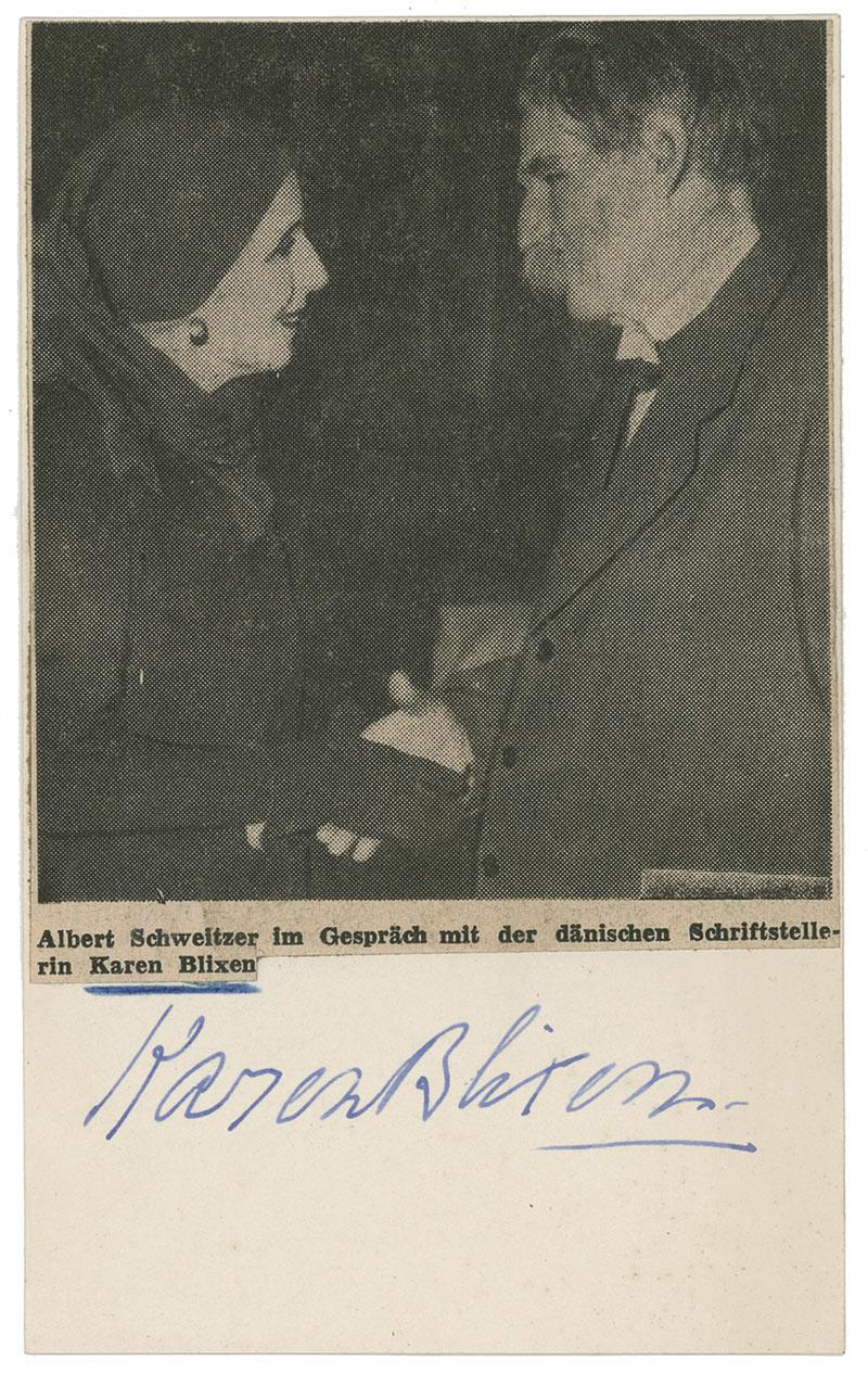 Pseudonym of prominent Danish author Karen Blixen (1885–1962), best known for her account of life in Kenya, Out of Africa, later adapted into an Academy Award–winning film. Vintage ink signature, “Karen Blixen,” on an off-white 3.5 x 5.75 card, with a clipped newspaper photo of Blixen shaking hands with Albert Schweitzer affixed above her signature. In fine condition. RRAuction COA.