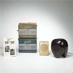 Isamu Noguchi Radio Nurse and Guardian Ear Zenith Radio Corporation USA, 1937 bakelite, enameled metal 7"w x 6"d x 8.25"h Exceptional Radio Nurse set, complete with bakelite nurse, enameled metal Guardian Ear, two original boxes and original instruction sheet.