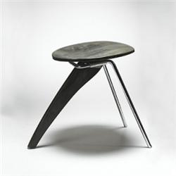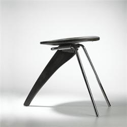 Isamu Noguchi Rudder stool, model IN-22 Herman Miller USA, c. 1948 enameled birch, steel, rubber 13"w x 20"d x 17"h Isamu Noguchi sought to make sculpture useful in everyday life and his furniture designs are an important part of this idea. In November 1942, Noguchi returned to New York after six months in a Japanese-American relocation camp and moved into a studio at 33 MacDougal Alley in Greenwich Village. Much of Noguchi's work from this period was aligned with the Surrealists, and it was at the MacDougal Alley studio in 1944 that he carved the biomorphic sculptures of interlocking elements that established his reputation in the New York School. In 1946, Noguchi participated in the seminal exhibition "14 Americans" at the Museum of Modern Art in New York. The rudder stool and table evolved out of his explorations of form at this time. Herman Miller Furniture Company in Zeeland, Michigan under George Nelson's direction began production of the designs in 1948, and they had a mixed reception in the marketplace. Ultimately, the designs proved too avant-garde for the general public, and the production ceased after only three years. Provenance: Henri Morgenroth, Santa Barbara
