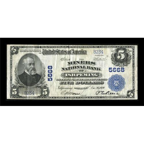 <B>Ishpeming, MI</B></I> - $5 1902 Plain Back Fr. 607 <B>The Miners NB</B></I> Ch. # 5668<BR> An attractive Upper Peninsula example bearing a much collected occupational title. Pen signed <B>Very Fine.</B></I><BR><BR><b>Shipping:</b> Coins & Currency (<a target="_blank" href="http://www.heritageauctions.com/common/shipping.php">view shipping information</a>)
