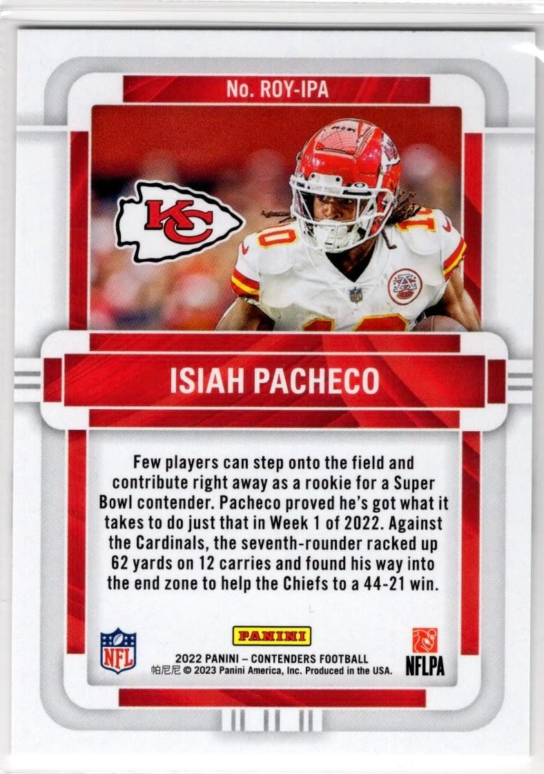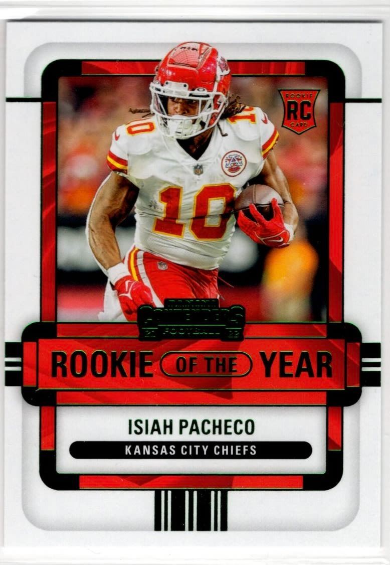 Isiah Pacheco 2022 Panini Contenders Rookie of the Year Emerald Rookie Card #ROY-IPA