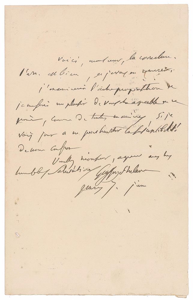 French zoologist (1805–1861) known for his work on anatomical abnormalities in humans and animals. Untranslated ALS in French, signed “Geoffroy St. Hilaire,” one page, 5.25 x 8.25, no date. In fine condition, with some small holes along the left side.
