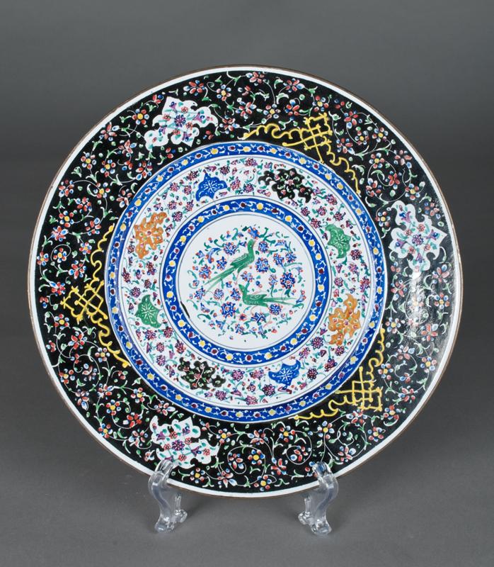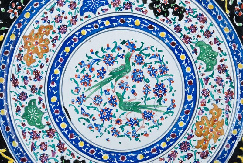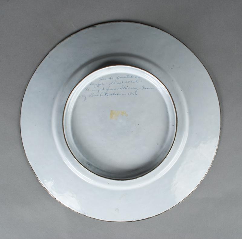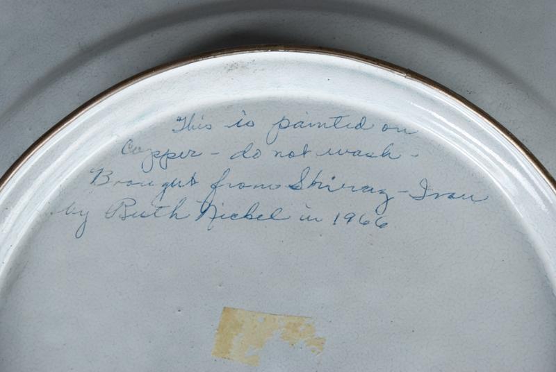 Finley painted to depict birds amongst foliage, with hand written inscription on back that states it was purchased in Iran in 1966, 8.75"D, circa 1940's.