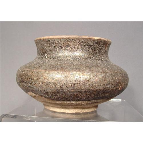 Islamic monochrome glazed ceramic jar with spherical body, short tapering neck resting on low foot-ring all covered by brown iridescent glaze except for the lower part of the body and the foot, Syria-Raqqua, 13th century AD. Condition: no cracks, no repairs, nice age patina and good signs of age. Height: 4 ½ in (11,5cm). Diameter: 3 ¾ in (9cm).